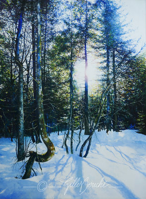 Il transcrit la nature accidentée, les rochers adoucis et écorchés, les lignes élancées d’une forêt, les jeux d’ombre dans le feuillage. Le geste est juste, précis. La palette explore les camaïeux frileux de l’hiver et ceux plus en rondeur de l’été. Le vent ondule les contrastes. La lumière impose ses codes aux sensibilités du pinceau.